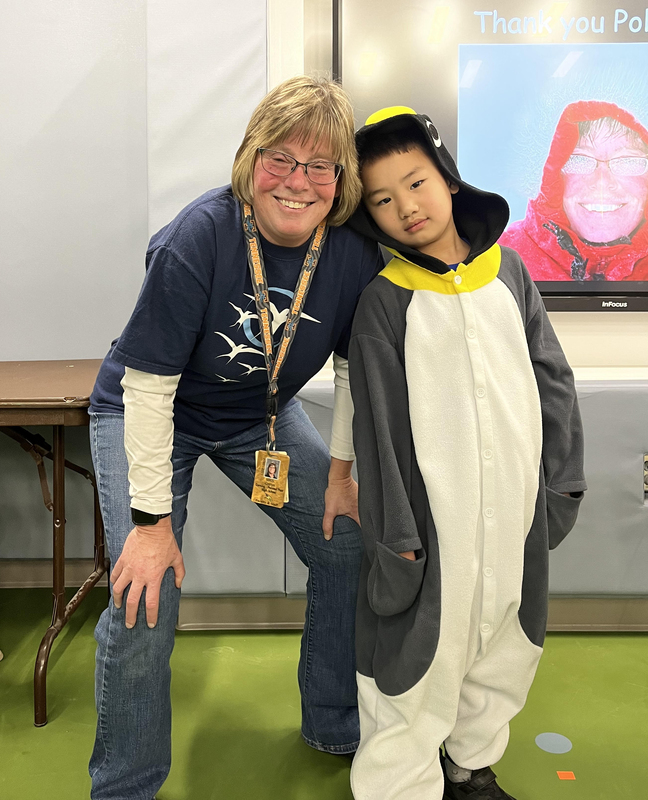 Ms. Cross with an EV student who dressed as a penguin for her presentation!